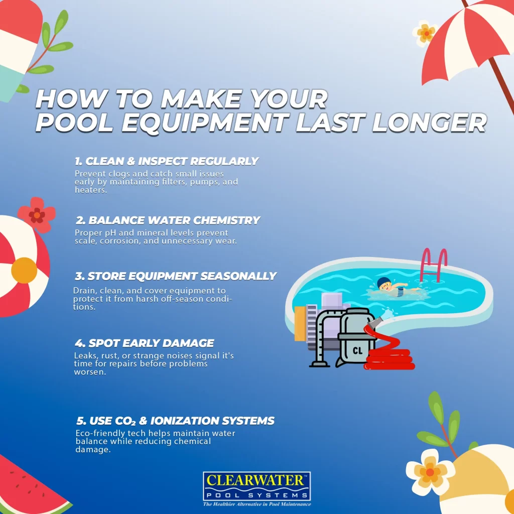 Balancing your pool’s water chemistry is essential for protecting your equipment. When pH and mineral levels are off, it can lead to corrosion and damage that shortens their lifespan. Using CO₂ injection and ionization systems can help you maintain that perfect balance for ideal performance.